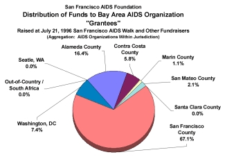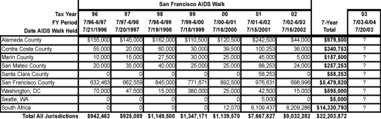 Promotional material for the 2004 AIDS Walk invites you to change the course of the epidemic. TheLastWatch.com challenges you to also help change the course in how AIDS Walk funds are more equitably shared with smaller AIDS Service Organizations in the Bay Area. Heres how you can change the course of sharing funds fairly. The San Francisco AIDS Foundation uses the grantee model when it shares funds with smaller AIDS Service Organizations (ASOs) in the Bay Area that are raised at various fundraising events. SFAF contracts with the Tides Foundation to award grants to smaller AIDS organizations. An alternative method of sharing revenue is referred to as the beneficiary model, which affords beneficiary organizations some control in how the funds raised are divided up among event partners, and provides for some control over fundraising events overhead expenses; true beneficiaries do not have to rely on the capriciousness of grants. When SFAF duked it out with Palotta Teamworks fighting for control over the California AIDS Ride, SFAF marched into court, and its Executive Director, Pat Christen, testified, convincing the judge that SFAF deserved control of the AIDS Ride because Palotta had forced SFAF to be a grantee rather than a full partner using the beneficiary model. The dirty little secret, however, is that SFAF is unwilling to admit that what is good for the goose is good for the gander. SFAF wants to have it both ways: It wants the beneficiary model applied to itself, but it is unwilling to allow smaller ASOs participating in the AIDS Walk to use the beneficiary model, forcing them into the grantee model, instead. By insisting on this double-standard, SFAF retains control over how money from the AIDS Walk and other fundraising events is distributed. As you can see in Figure 1 below, according to its tax return for the period ending in June 2003, SFAF had increased the amount of grants paid to its global affiliate, the Pangaea Global AIDS Foundation (at which organization Pat Christen is simultaneously its president) to 91% of the grants it reported to the IRS it had made. Of the $9,032,282 SFAF reported to the IRS it had shared in its grantmaking awards for the period ending in June 2003, $8.2 million of it went to Pangaea, up from the $5.9 million it had awarded to Pangaea as grants paid in the period ending in June 2002 (both amounts exclude additional millions in grants remaining payable to Pangaea ending in 2002 and 2003, and also exclude both grants paid + grants payable to Pangaea that my have been made during the period July 2003June 2004). At the same time, many of the smaller ASOs in the surrounding Bay Area saw their grant awards reduced, or eliminated between 2002 and 2003. ![]() For instance, Project Inform, located in San Francisco County, saw its 2002 grant of $120,000 shrivel to just $2,500 in 2003. The AIDS Emergency Fund which awards emergency direct financial assistance to people with HIV/AIDS also located in San Francisco County, saw its award shrink by half, from $50,000 to $25,000 across the two fiscal years. The Larkin Street Youth Center saw its $12,500 award in 2002 reduced to nothing in 2003; another San Francisco County ASO, the Black Coalition on AIDS, also saw its 2002 grant of $15,000 reduced to zero in 2003. Switching to Alameda County which had received 16.4% of the funds distributed from AIDS Walk 1996 as shown in Figure 2, but has dropped to only 0.5% of the awards shown in Figure 1 Women Organized to Respond to Life-Threatening Diseases (WORLD), saw its award plummet by $20,000, down to $15,000 from the 2002 award of $35,000. As well, the HIV Education and Prevention Project of Alameda County saw its $57,500 award in 2002 reduced to zero in 2003. In Oakland, which is also in Alameda County, La Clinica de La Raza/Fruitvale Health Project has not received AIDS Walk funds since it last received a grant from the July 18, 1999 AIDS Walk. ![]() Over in Contra Costa County, the AIDS Community Network in Richmond saw its 2002 award of $15,000 also reduced to zero in 2003, while over in Marin County, the Marin AIDS Project saw its 45,000 award in 2002 reduced to just $5,000 in 2003. The AIDS Prevention Action Network, located in Redwood City in San Mateo County, saw its 2002 award of $48,253 reduced to zero in 2003. Table 1 summarizes the amount of funds awarded to various ASOs by county. For a detailed list of each ASO by county, please refer to the attached PDF file. Table 1 (Shows only grants